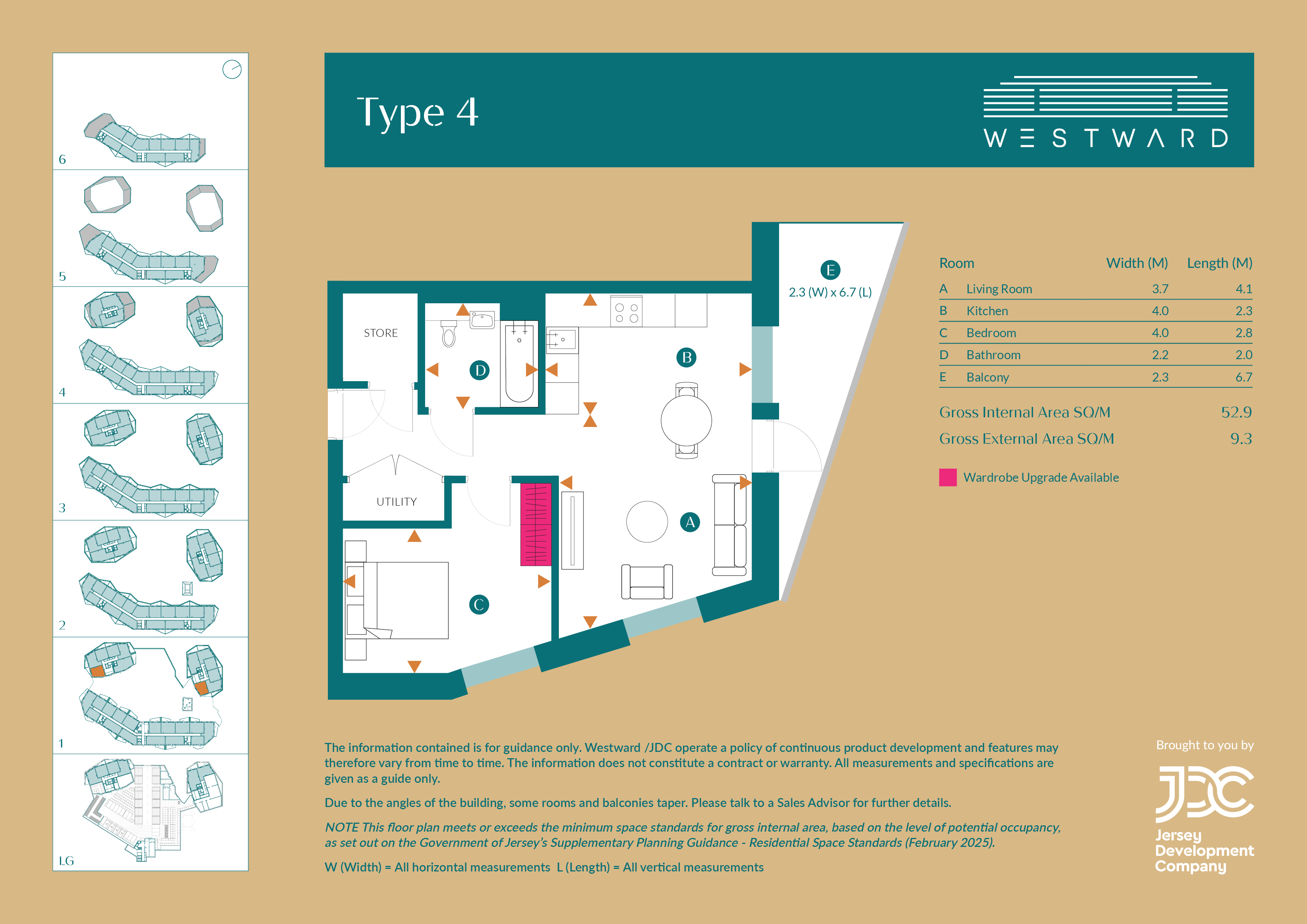 The bedroom, with an option to upgrade to a built-in wardrobe, sits peacefully away from the living space and features floor-to-ceiling windows. A large utility/store cupboard is included, and the bathroom is finished with elegant fixtures and modern materials.